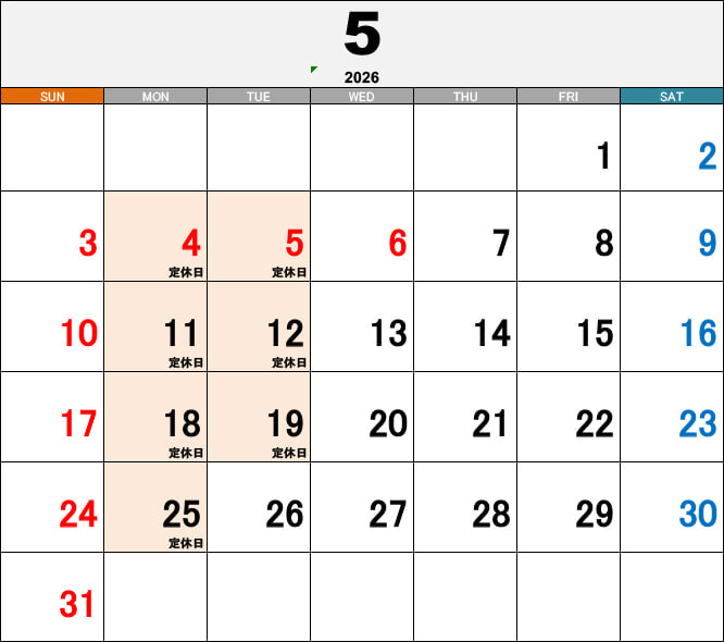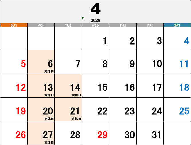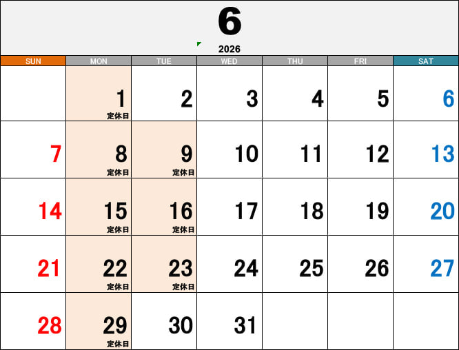 | 定休日 | 毎週月曜日、第2、3火曜日 |