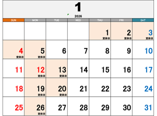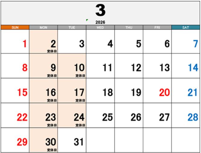 | 定休日 | 毎週月曜日、第2、3火曜日 |